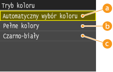 Urządzenie oferuje tryb <Automatyczny wybór koloru>, w którym najpierw rozpoznawane jest, czy dokument oryginalny jest kolorowy czy czarno-biały, po czym następuje automatyczne przełączenie w tryb Pełna gama kolorów lub Czarny. Można również ręcznie przełączać tryby <Pełne kolory> i <Czarno-biały> zależnie od potrzeb.