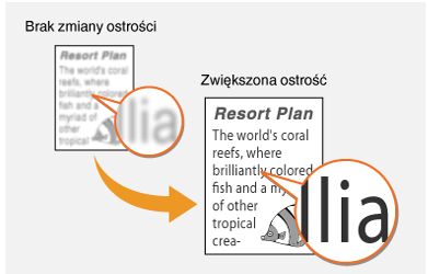 Przed wysłaniem obrazu można dostosować jego ostrość. Można zwiększyć ostrość w celu wyostrzenia niewyraźnego tekstu i linii lub zmniejszyć ostrość, aby poprawić wygląd fotografii z magazynu.