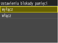 Aby wydrukować odebrane dokumenty zapisane w pamięci, ustaw opcję <Ustawienia blokady pamięci> na <Wyłącz>. Wszystkie dokumenty przechowywane w pamięci zostaną wydrukowane.
