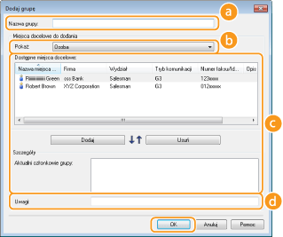 Wybierz odbiorców, których chcesz zapisać w opcji Wybieranie grupowe i kliknij przycisk [Dodaj]. Wybrani odbiorcy są wyświetlani na liście [Aktualni członkowie grupy].