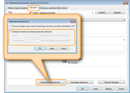 W przypadku wyboru pozycji [Zabezpiecz hasłem przy eksportowaniu listy adresowej], umieszczonej w oknie dialogowym [Ustawienia zabezpieczeń] w karcie [Specjalne], po kliknięciu przycisku [Eksportuj] zostanie wyświetlone okno dialogowe wprowadzania hasła. Aby uzyskać więcej informacji, kliknij pozycję [Pomoc] na ekranie sterownika faksu.