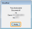 Anulowanie z poziomu aplikacjiW niektórych aplikacjach wyświetlany jest ekran podobny do poniższego. Wydruk można anulować, klikając przycisk [Anuluj].