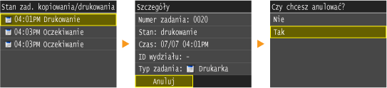 Anulowanie w Zdalnym interfejsie użytkownikaWydruk można anulować na stronie [Stan zadania] w Zdalnym interfejsie użytkownika: Sprawdzanie bieżącego stanu drukowanych dokumentów