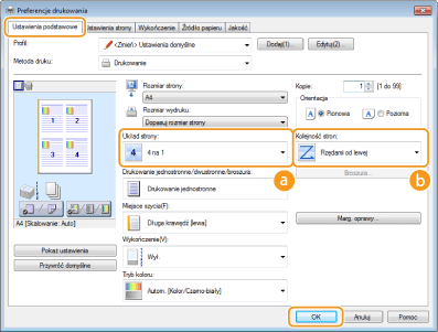 Zakładka [Ustawienia podstawowe]  W sekcji [Układ strony] określ liczbę stron, która ma zostać wydrukowana na jednym arkuszu W sekcji [Kolejność stron] wybierz sposób rozmieszczenia elementów na stronie  [OK]