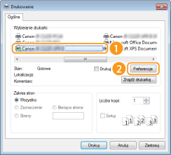 Wybierz sterownik drukarki do urządzenia, po czym kliknij pozycję [Preferences] (Preferencje) (lub [Properties] (Właściwości)).