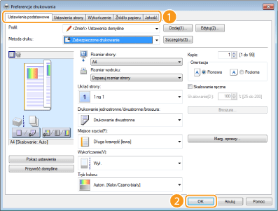 Kliknij kolejno karty [Ustawienia podstawowe], [Ustawienia strony], [Wykończenie], [Źródło papieru] lub [Jakość], aby na każdym ekranie skonfigurować ustawienia wydruku w zależności od potrzeb. Różne ustawienia drukowania