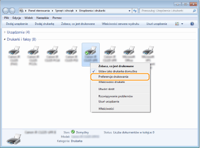 Kliknij prawym przyciskiem myszy ikonę drukarki, a następnie kliknij pozycję [Printing preferences] (Preferencje drukowania).