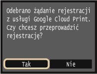 Istnieje także możliwość rejestracji urządzenia za pomocą urządzenia mobilnego lub przeglądarki Google Chrome*. Przed dokończeniem rejestracji wyświetlacz urządzenia prezentuje niżej ukazany ekran potwierdzenia. Naciśnij przycisk <Tak>, aby ukończyć proces rejestracji.