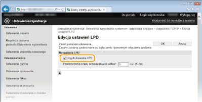 Zaznaczenie tego pola wyboru umożliwia wydruk za pomocą protokołu LPD. Jeśli drukowanie za pomocą protokołu LPD nie jest używane, należy usunąć zaznaczenie tego pola wyboru. [Użyj wydruku RAW]