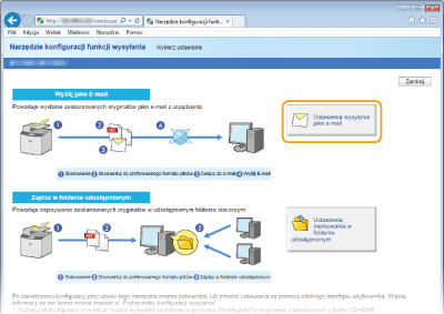 Bardziej szczegółowe ustawienia można skonfigurować za pomocą Zdalnego interfejsu użytkownika zamiast korzystania z aplikacji Narzędzie konfiguracji funkcji wysyłania (Konfiguracja zaawansowanych ustawień e-mail). Program Narzędzie konfiguracji funkcji wysyłania jest przydatny dla użytkowników, którzy chcą wykonać konfigurację w prosty sposób.