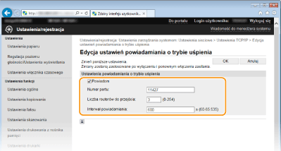 Zaznaczenie tego pola wyboru umożliwia powiadamianie oprogramowania do zarządzania urządzeniami o stanie zasilania urządzenia. Zaznaczenie opcji [Powiadom] pozwala na uniknięcie nawiązywania przez urządzenie zbędnej komunikacji w trybie uśpienia i zmniejszenie całkowitego zużycia energii. [Numer portu]
