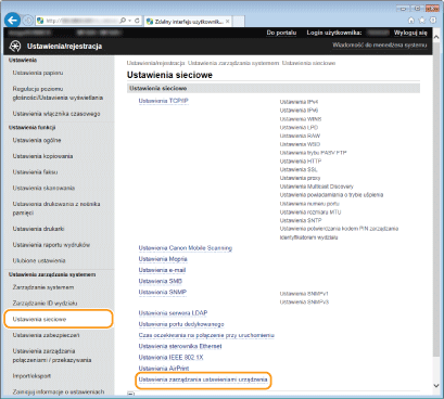 Należy odpowiednio skonfigurować dedykowany port i ustawienie SNMP (SNMPv1 lub SNMPv3), aby umożliwić komunikację z wtyczką programu Oprogramowanie iW Management Console. Wybierz [Odczyt/zapis] (uprawnienie do pełnego dostępu) dla opcji [Uprawnienia dostępu do MIB] w ustawieniach SNMP (SNMPv1 lub SNMPv3). Ustawienia portu dedykowanego Monitorowanie i kontrolowanie urządzenia za pomocą protokołu SNMP