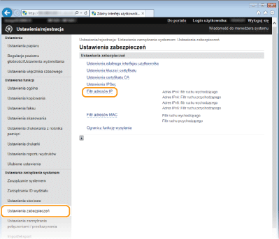 Nieprawidłowo wprowadzone adresy IP mogą uniemożliwić dostęp do urządzenia z poziomu Zdalnego interfejsu użytkownika. Konieczne będzie wtedy ustawienie filtra <Filtr adresów IPv4> lub <Filtr adresów IPv6> na wartość <Wyłącz>. Filtr adresów IPv4 Filtr adresów IPv6