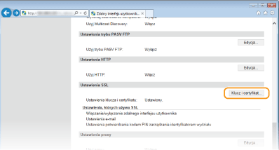 Dostępna jest funkcja szyfrowania komunikacji między urządzeniem a przeglądarką internetową na komputerze za pomocą protokołu TLS (Transport Layer Security). TLS to mechanizm szyfrowania danych wysyłanych lub odbieranych za pośrednictwem sieci. Funkcja szyfrowania TLS musi być włączona, gdy Zdalny interfejs użytkownika jest używany do konfiguracji ustawień IPSec (Metoda klucza współdzielonego), uwierzytelniania zgodnego ze standardem IEEE 802.1X (TTLS/PEAP) lub SNMPv3. Aby zastosować TLS w Zdalnym interfejsie użytkownika, trzeba zapisać parę kluczy i włączyć funkcję TLS. Przed włączeniem funkcji TLS należy wygenerować lub zainstalować parę kluczy dla protokołu TLS (