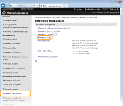 Kliknij kolejno elementy [Ustawienia zabezpieczeń] [Ustawienia IPSec].