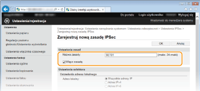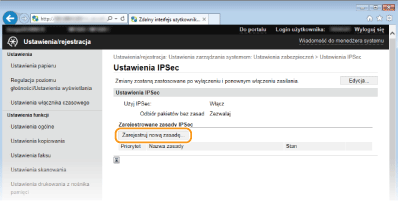 Przed użyciem protokołu IPSec do szyfrowania komunikacji należy zarejestrować zasady bezpieczeństwa (SP). Zasada bezpieczeństwa składa się z grupy ustawień opisanych poniżej. Można zarejestrować maksymalnie 10 zasad. Po zakończeniu rejestracji zasad należy określić kolejność ich stosowania.