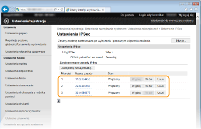 Ustaw kolejność zasad wyszczególnionych na liście w pozycji [Zarejestrowane zasady IPSec].