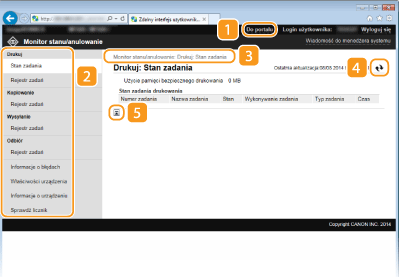 Wyświetla stan aktualnie drukowanych dokumentów, historię wydruku, kopiowania oraz wysyłania, a także otrzymane dokumenty. Umożliwia także sprawdzenie stanu urządzenia.