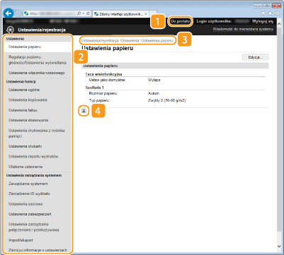 Wyświetla stronę [Ustawienia/rejestracja]. Po zalogowaniu się w trybie menedżera systemu można zmienić elementy ustawień i zapisać lub załadować zarejestrowane dane.