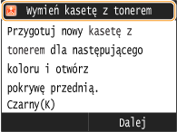 Zasobników z tonerem nie należy wymieniać, zanim nie pojawi się komunikat informujący o konieczności ich wymiany.