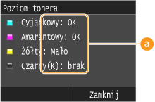 Na wyświetlaczu pojawi się kolor toneru, który należy wymienić. Jeżeli konieczna jest wymiana wielu zasobników z tonerem, zasobniki należy wymieniać w poniższej kolejności: Czarny, Żółty, Karmazynowy, Cyjankowy.