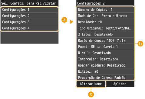 Pode registar até quatro combinações de definições de cópia utilizadas frequentemente. Selecionando simplesmente uma combinação de definições registada quando for preciso, não será necessário configurar as mesmas definições sempre que quiser fazer cópias, como, por exemplo, se definir frequentemente o número de cópias como 5, definir <Apagar Moldura> como <Ativado> e aumentar a nitidez para copiar. Pode registar as combinações de definições com qualquer nome.