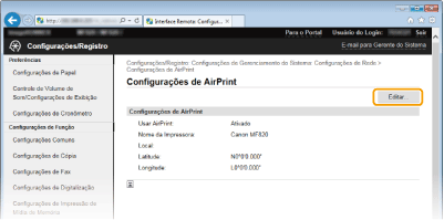 Pode registar informações, incluindo o nome da máquina e o local de instalação, que são utilizadas para identificar a máquina. Também pode desativar a função AirPrint da máquina. Utilize a UI Remota para alterar essas definições.
