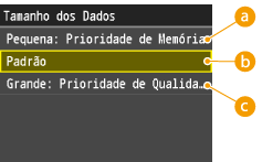 Os documentos digitalizados são convertidos nos formatos de ficheiro especificados. Nessa altura, pode especificar o rácio de compressão dos ficheiros. <Pequena: Prioridade de Memória> torna o rácio de compressão mais elevado do que o normal para criar ficheiros mais pequenos com uma qualidade de imagem inferior. Por outro lado, <Grande: Prioridade de Qualidade da Imagem> torna o rácio de compressão mais baixo do que o normal para criar ficheiros maiores com uma qualidade de imagem superior.