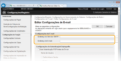 Utilize a UI Remota para configurar definições detalhadas de correio eletrónico, como, por exemplo, autenticação POP antes de SMTP e codificação através de TLS. Para obter mais informações sobre as definições necessárias, contacte o fornecedor de serviços de Internet ou o administrador de rede.