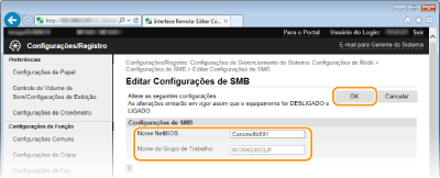 O SMB (Server Message Block) é um protocolo que permite partilhar recursos, como ficheiros e impressoras, com mais de um dispositivo numa rede. A máquina utiliza o SMB para guardar documentos digitalizados numa pasta partilhada. Dependendo da rede, poderá ser necessário definir o nome NetBIOS e o nome de grupo de trabalho.