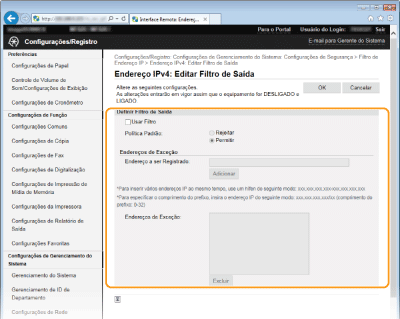 Se os endereços IP não forem introduzidos corretamente, poderá não conseguir aceder à máquina a partir da UI Remota; nesse caso, será necessário definir <Filtro de End. IPv4> ou <Filtro de End. IPv6> como <Desativado>. Filtro de End. IPv4 Filtro de End. IPv6