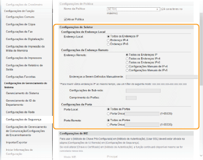 Selecione esta opção para utilizar IPSec para todos os pacotes IP que sejam enviados para ou a partir do endereço IPv6 da máquina.