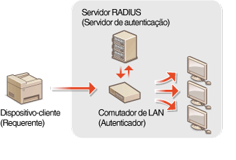 A máquina pode estabelecer ligação a uma rede 802.1X como um dispositivo-cliente. Uma rede 802.1X típica é constituída por um servidor RADIUS (servidor de autenticação), comutador de LAN (autenticador) e dispositivos-cliente com software de autenticação (requerentes). Se um dispositivo tentar estabelecer ligação à rede 802.1X, o dispositivo tem de passar por uma autenticação de utilizador para provar que a ligação é feita por um utilizador autorizado. Os dados de autenticação são enviados e verificados por um servidor RADIUS, que permite ou rejeita a comunicação destinada à rede, dependendo do resultado da autenticação. Se a autenticação falhar, um comutador (ou um ponto de acesso) de LAN bloqueia o acesso proveniente do exterior da rede.
