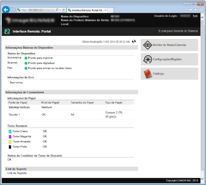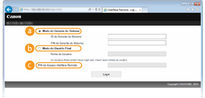 Pode efetuar todas as operações e definições da UI Remota. Introduza a ID adequada em [ID do Gerente do Sistema] e o PIN em [PIN Gerente Sistema] (
