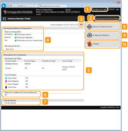 Apresenta a ligação de suporte especificada no item [Informações do Dispositivo] em [Gerenciamento do Sistema].