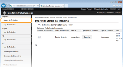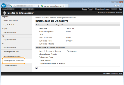 São apresentadas informações relativas à máquina e ao administrador de sistema. Essas informações são definidas em [Gerenciamento do Sistema] na página [Configurações/Registro].