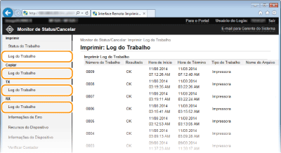 O histórico de impressão, cópia, envio de faxes/mensagens de correio eletrónico (TX) ou receção de faxes (RX) é apresentado com um número máximo de 128 trabalhos.