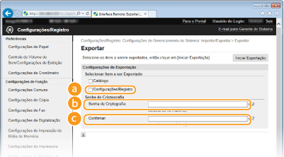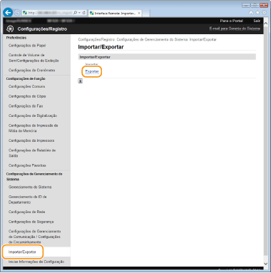 Pode guardar os dados de definições das opções dos menus no computador ou registar os dados guardados na máquina. É possível importar os dados exportados. Se utilizar o mesmo modelo, outras máquinas podem importar os dados exportados da máquina e vice versa. Essas operações só podem ser efetuadas se iniciar sessão no Modo do Administrador de Sistema.