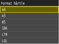 Dacă ecranul afişat mai sus nu este afişat când încărcaţi hârtieDacă încărcaţi mereu aceeaşi hârtie în tava universală, puteţi sări peste setarea pentru hârtie dacă înregistraţi dimensiunea şi tipul hârtiei ca setare implicită. Când setarea implicită este înregistrată, totuşi, ecranul de mai sus nu este afişat. Pentru a afişa ecranul, clic pe <Oprit> pentru <Înregistrare setări implicite> (Înregistrarea setărilor implicite de hârtie pentru tava universală).