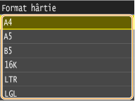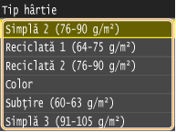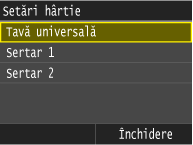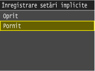 După ce este înregistrată setarea implicită, ecranul pentru setarea hârtiei nu este afişat când încărcaţi hârtie şi este folosită aceeaşi setare mereu. Dacă încărcaţi o altă dimensiune de hârtie fără a modifica setările hârtiei, este posibil ca aparatul să nu imprime corect. Pentru a evita această problemă, dezactivaţi setarea implicită selectând <Oprit> la pasul 3 şi încărcând apoi hârtia.