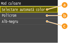 Acest aparat este livrat cu modul <Selectare automată color>, care identifică dacă un original este color sau alb-negru şi comută automat între modul Policrom şi modul Alb-negru. De asemenea, puteţi comuta manual între modurile <Policrom> şi <Alb-Negru> ori de câte ori este necesar.
