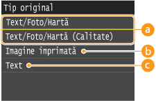 Puteţi selecta calitatea optică pentru imagine pentru copiere în funcţie de tipul documentului, precum documente care conţin doar text, documente cu tabele şi grafice sau reviste cu fotografii.