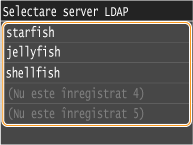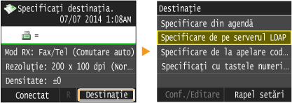 Dacă aveţi instalat un server LDAP în birou, puteţi folosi destinaţiile înregistrate în server. Pentru a specifica destinaţii, accesaţi serverul LDAP prin intermediul aparatului şi apoi căutaţi o destinaţie.