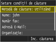 Criteriile disponibile pentru căutarea destinaţiilor sunt nume personale, numere de fax, adrese de e-mail, nume organizaţie şi nume departament. Puteţi specifica mai multe criterii de căutare în acelaşi timp.
