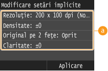 Setările implicite sunt setările care sunt afişate când porniţi aparatul sau când apăsaţi