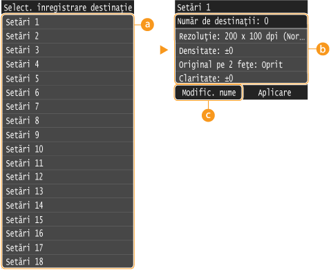 Pentru toate setările pe care le-aţi înregistrat, puteţi modifica ulterior oricare dintre valorile lor altele decât destinaţia.