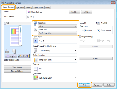 Selectaţi dimensiunea hârtiei în [Output Size] (Dimensiune imprimare)