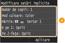 Setările implicite sunt setările care sunt afişate când porniţi aparatul sau când apăsaţi