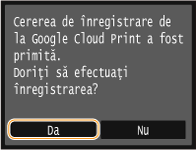 Vă puteţi înregistra aparatul si de pe un dispozitiv mobil sau din Google Chrome*. Afişajul aparatului indică următorul ecran de confirmare înainte de finalizarea înregistrării. Apăsaţi <Da> pentru a finaliza înregistrarea.