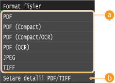 Puteţi selecta formatul fişierului în care documentele sunt transformate. Documentele scanate sunt transformate în formatul fişierului specificat aici şi apoi trimise la destinaţia specificată.
